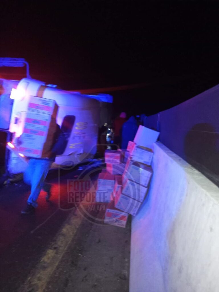 Tlacolulan, Ver. 13/Marzo/2025 La madrugada de este día se registró la volcadura de un tráiler que transportaba abarrotes sobre la autopista Xalapa–Perote, a la altura de la localidad El Fresno.