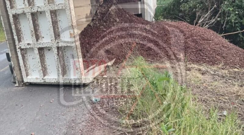 Naolinco, Ver.,27-noviembre-2025.-La tarde de este jueves se registró la volcadura de un camión volteo cargado con grava sobre la carretera Xalapa–Misantla, a unos kilómetros antes de llegar a Naolinco, a la altura del rancho La Fábula.