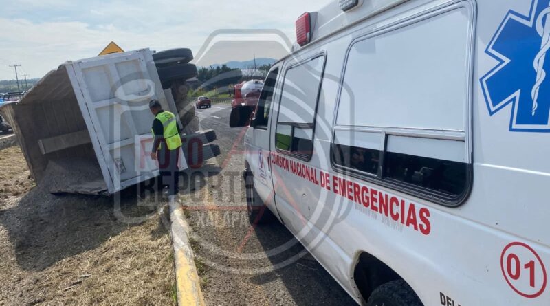 El accidente ocurrió cuando la unidad, cargada con grava triturada, perdió el control y volcó sobre su costado, esparciendo el material sobre la vía. El chofer de la unidad, un joven de 20 años identificado como José Manuel H. M., quedó prensado al interior del vehículo debido al fuerte impacto.