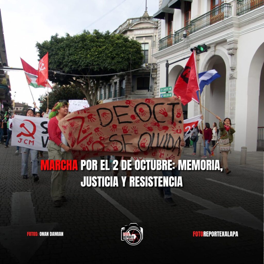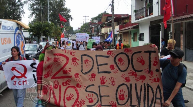 El 2 de octubre de 1968, en la Plaza de las Tres Culturas, miles de estudiantes y ciudadanos fueron brutalmente reprimidos por el ejército y la policía, resultando en la muerte de cientos de personas. A más de medio siglo, los manifestantes en Xalapa señalaron que esa represión contra la juventud continúa bajo nuevas formas: precariedad laboral, desempleo, criminalización del activismo, represión policiaca, despojo territorial y violencia de género.