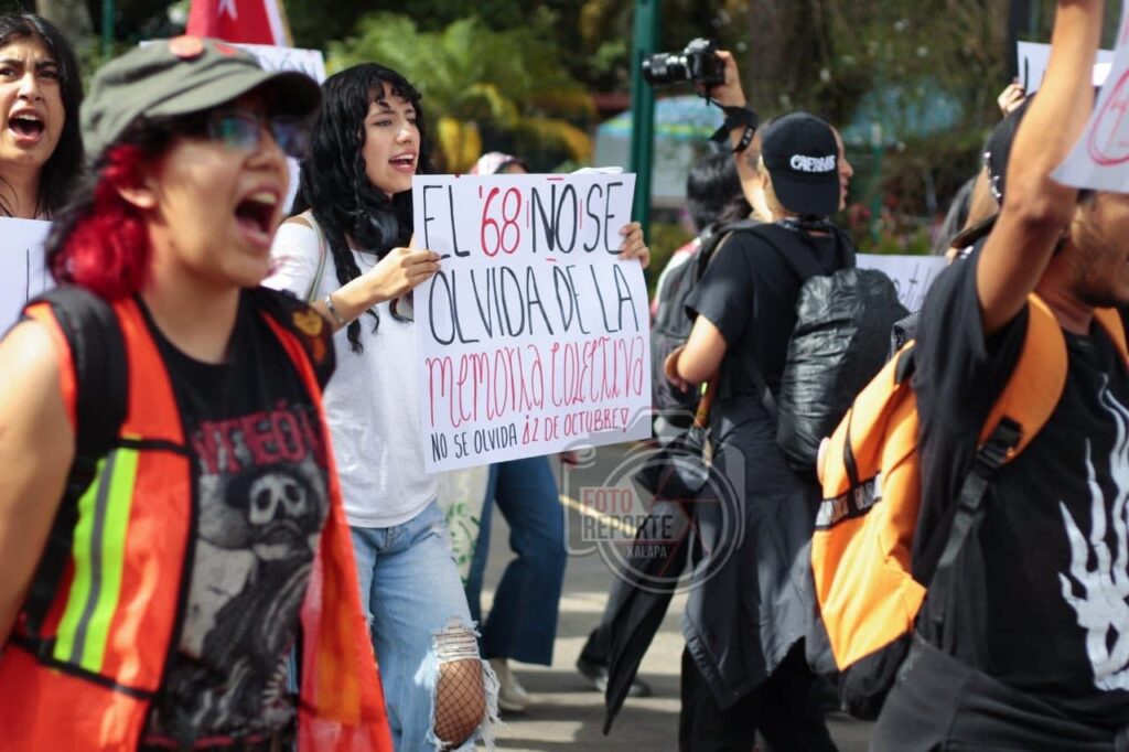 Las movilizaciones partieron de la Rectoría de la Universidad Veracruzana y de la Facultad de Humanidades, para luego confluir en la plaza Lerdo, donde estudiantes, activistas y ciudadanos gritaron consignas, portaron pancartas y recordaron a las víctimas de la represión de hace 57 años.